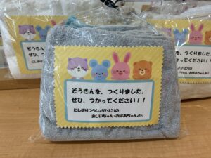 利用者の皆様が手作りしたものです。綺麗なタオルで丁寧に作ってありました。