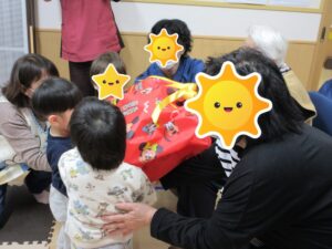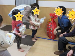 雑巾の他に、子ども達におもちゃをプレゼントして下さいました。自分の体よりも大きな袋に、驚いた様子の子ども達。とても嬉しそうでした。